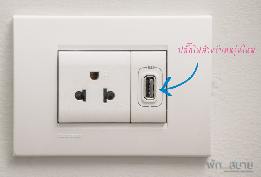 ส่วนปลั๊กไฟในห้องพักทุกห้อง หน้าตาจะเป็นแบบนี้ มีช่อง USB ให้เสียบ แทบทุกจุดที่มีปลั๊กเลย