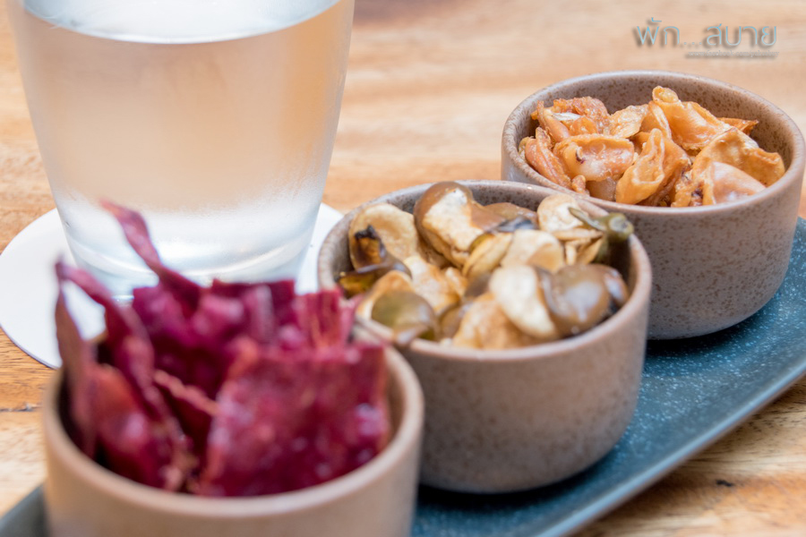 ส่วนคนที่มาสั่งเครื่องดื่มจะได้ชุดกับแกล้มทานเล่นฟรีด้วยฮะ ไฮไลท์สำหรับ ชุดกลับแกล้มก็คือ ปลาหมึกแห้งทอดกรอบฮะ ลุงทุนมากจริงๆ