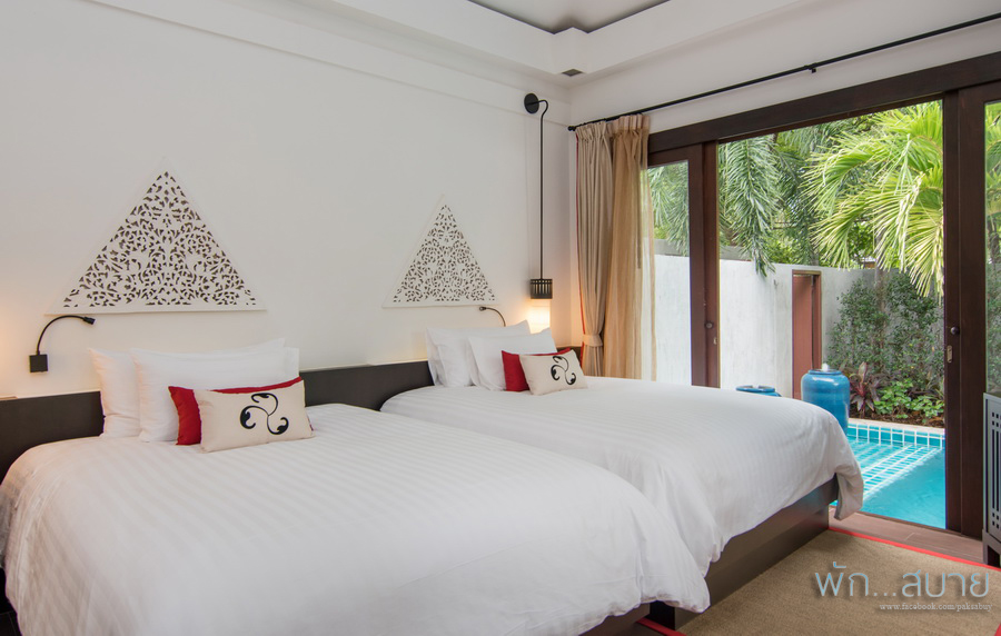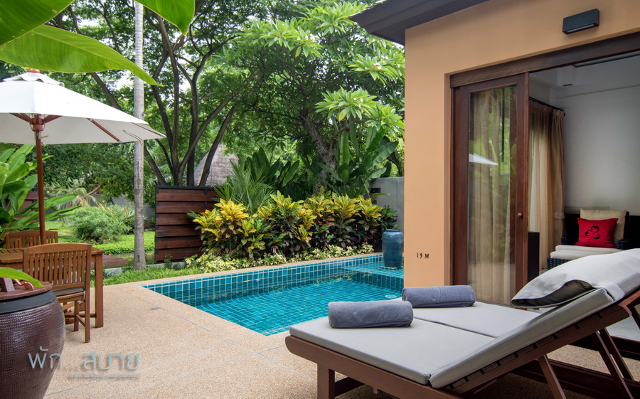 ขนาดห้องระดับนี้จะอัพพื้นที่ขึ้นมาที่ 150 ตรม ห้องระดับนี้ จะมีด้วยกัน 2 แบบ คือ กำแพงปิดมิดชิดเลย กับ กำแพงเปิดชมวิวสวนได้ ราคาตอนนี้เท่ากันฮะ ขึ้นกับเราชอบแบบไหน  ห้องพัก Private Pool Villa นี้ ส่วนใหญ่จะเหมือน Terrace Suite แค่แยกห้องนั่งเล่นออกมาไว้ต่างหากเลย และส่วนที่ระเบียงก็มีสระมาแทนที (สระไม่ได้ใหญ่นะฮะ ขนาดทั่วไปมาก ว่ายได้ 3 จ้วง)