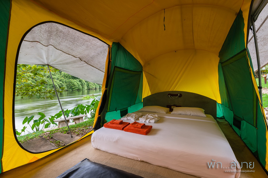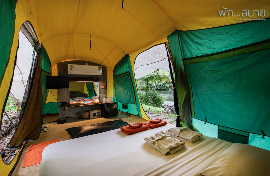 ห้องเริ่มต้น เป็นเต็นท์ติดแอร์ฮะ (อันนี้จะอยู่ที่ โซนเก่า) มีสองแบบ ( มีพื้นที่ประมาณ 20 ตร.ม. ข้างในมีที่นอนสบายสำหรับ 2 คน และสิ่งอำนวยความสะดวกครบครัน ทั้งทีวี, แอร์, ตู้เซฟ, ตู้เย็น รวมถึงฟรี Wi-Fi แต่ไม่มีห้องน้ำในตัว ต้องใช้ห้องน้ำรวม ซึ่งสะอาดใช้ได้เลย โซนนี้จะเหมาะกับคนที่อยากนอนใกล้ริมน้ำจริงๆฮะ ราคาเริ่มต้นจะตกประมาณ 2000 รวมอาหารเช้าฮะ
