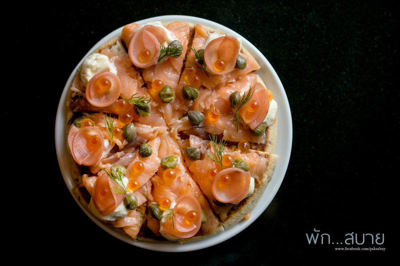 แอตแลนติกแซลมอนรมควันเสิรฟกับซาวครีม THB 420++ จานนี้คล้านฟิซซ่าแต่ไม่ใช่ฮะ แค่หน้าตาเหมือน รสชาติเหมือน พวก ทาปาส คานาเป้มากกว่า ด้านล่างเป็นขนมปังเนื้อแน่นๆฮะ