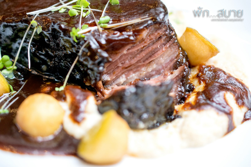 เนื้อซี่โครงตุ๋นเสิร์ฟพร้อมซอสไวน์แดง 720++ จานนี้อร่อยลืม กินปากมันมากกกกก เชฟบอกตุ๋นนานมากกกก หน้าตามนจะดำๆไม่ค่อยดูน่าพิศมัยสักเท่าไหร่ แต่เจือกอร่อย