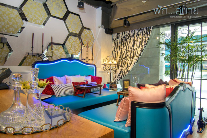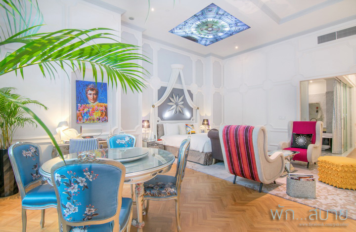 ที่เห็นโซฟาสีฟ้าสดรูปร่างคล้ายเตียงนั้น ได้แรงบรรดาลใจมาจากการเสริฟอาหารเช้าบนเตียงครับ จึงทำโซฟาให้ออกมาเป็นรูปเตียง