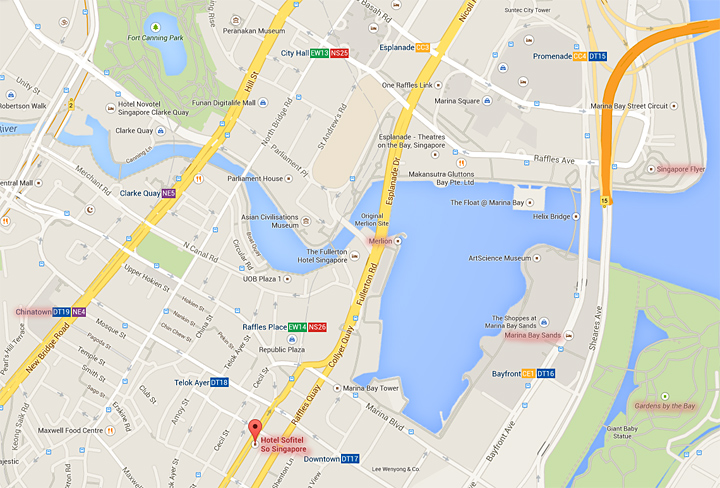 ขอเริ่มจากแผนที่กันก่อน จะเห็นได้ว่า Sofitel So Singapore อยู่ใกล้กับอ่าวมาริน่าและไชน่าทาวน์ สามารถเดินไปได้เลยครับ ถ้าเราเดินทางมาด้วยรถไฟใต้ดิน ให้เราลงที่สถานี raffle place station ทางออกที่เป็น ถนน robinson เราเดินตามถนนโรบินสันลงมาเรื่อยๆสัก 5 นาทีเราจะเจอโรงแรมอยู่ติดกับ lau pa sat food market