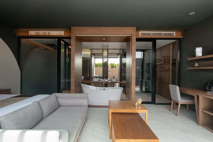 ห้อง Suite with Private Pool ขนาด 86 ตรม ถือเป็นห้องที่เรียกว่าคุ้มค่าที่สุดในโรงแรม ด้วยราคาที่จ่ายไปประมาณ 6xxx ถือว่าห้องใหญ่มากๆ เมื่อเทียบกับราคา อยู่กันหลวมๆเลย แถมเดินจากห้องไปหาดแค่นาทีเดียวเท่านั้น